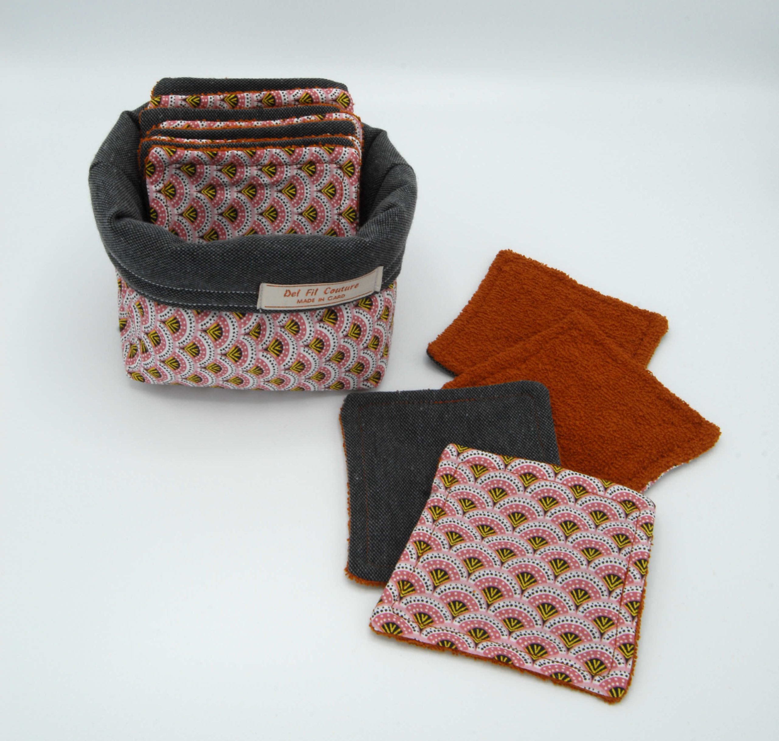 Le lot comporte 12 lingettes en coton éponge couleur rouille et grise avec un tissu décoratif.